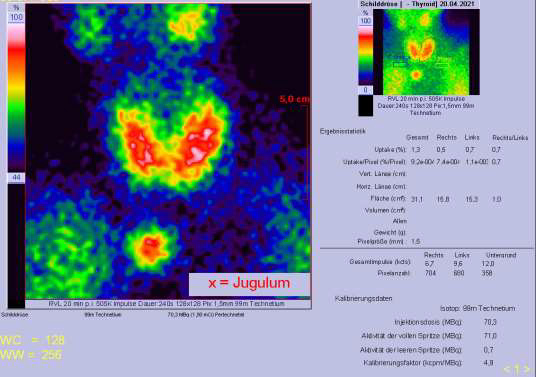 Während die Schilddrüse die Substanz rasch wieder abgibt, verweilt die Substanz in den Nebenschilddrüsen länger und es findet eine zunehmende Kontrastierung der Nebenschilddrüsen statt.